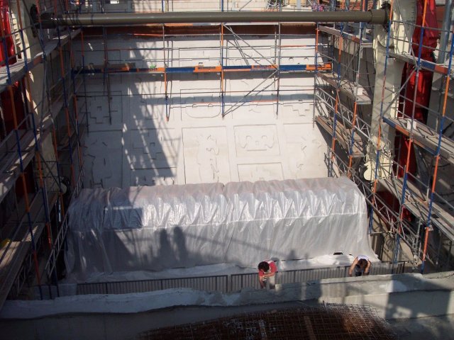 Wie auf den Artworks zu sehen ist, sollen die Seitenwände in einer Art Scheibe Thematisiert werden. Um eine saubere Aufteilung der Scheibe zu erhalten - verschiedenartige Darstellungen - wurden die Linien auf den Seitenwänden aufgebracht. Linien die nicht passten, sind wieder ausgeixt worden. Zu den Rissen an den Leibungen: Grundsätzlich wird der aus Beton gegossene Baukörper keine Risse bekommen. Dafür ist dort zu viel Bewehrung eingebaut worden. Die Risse sind von Maliboy richtig erkannt worden. Die Öffnungen sind nur provisorisch mit Span- oder Rigipsplatten geschlossen worden. Die Leibungen werden ihren Endanstrich erst erhalten, wenn die Platten entfernt wurden, da die Kanten noch nachgearbeitet werden müssen. Gruß Hermann |